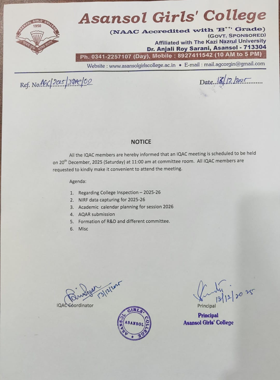 Asansol Girls’ College, affiliated to Kazi Nazrul University, stands as a beacon of women’s education in this region a sanctuary of learning, aspiration, and empowerment since 1950. Founded through the vision and dedication of Dr. Lalit Mohan Sen and Smt. Kamala Sen, and strengthened by the untiring efforts of Dr. Anjali Roy, the College has grown from its modest beginnings at Manimala Girls’ High School into a vibrant institution that shapes dreams and transforms lives.